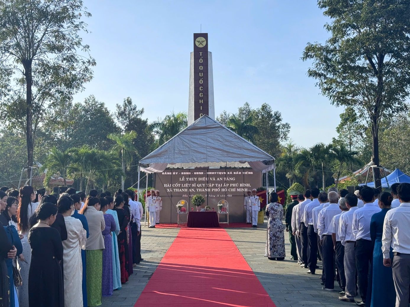 Sau hơn một tháng tổ chức khảo sát, tìm kiếm, xác minh thông tin và phối hợp triển khai tại khu vực ấp Phú Bình, nơi từng là tuyến Quân y chăm sóc, điều trị thương binh của đơn vị Q16 (thuộc R Miền). Bộ tư lệnh thành phố đã phát hiện và quy tập được 2 hài cốt liệt sĩ. Đây là kết quả của sự nỗ lực, trách nhiệm và tinh thần tri ân sâu sắc đối với các anh hùng liệt sĩ của cấp ủy, chính quyền địa phương cùng các lực lượng tham gia tìm kiếm. Dù chưa xác định được đầy đủ danh tính, nhưng sự hy sinh anh dũng của các liệt sĩ là biểu tượng thiêng liêng của lòng yêu nước, ý chí kiên cường và tinh thần bất khuất của dân tộc Việt Nam; là niềm tự hào và trách nhiệm gìn giữ, tiếp nối của các thế hệ hôm nay. Trong giây phút thiêng liêng, các đại biểu và Nhân dân đã kính cẩn nghiêng mình, dâng hương, dâng hoa và dành phút mặc niệm, bày tỏ lòng tri ân sâu sắc đối với các anh hùng liệt sĩ, những người đã hiến dâng trọn đời mình cho độc lập, tự do của Tổ quốc và hạnh phúc của Nhân dân. Cũng trong buổi lễ, các đoàn đại biểu đã dâng hương, dâng hoa tại Đài tưởng niệm các anh hùng liệt sĩ tại nghĩa trang liệt sĩ xã Dầu Tiếng nhân kỷ niệm 81 năm ngày thành lập QĐND VN (22/12/1944 – 22/12/2025) và 36 năm ngày hội quốc phòng toàn dân (22/12/1989 – 22/12/2025).