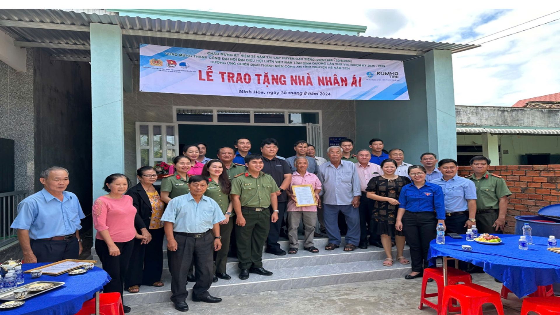 Ngày 30/8/2024, UBND huyện Dầu Tiếng tổ chức Lễ công bố và trao Quyết định tặng nhà nhân ái cho ông Nguyễn Công Điền, sinh năm 1948 ngụ tại ấp Hòa Hiệp, xã Minh Hòa, huyện Dầu Tiếng, tỉnh Bình Dương (nguồn kinh phí vận động hỗ trợ từ Công ty Kumho Tire và Tập đoàn Charm group với tổng trị giá căn nhà là 150.000.000 đồng).
